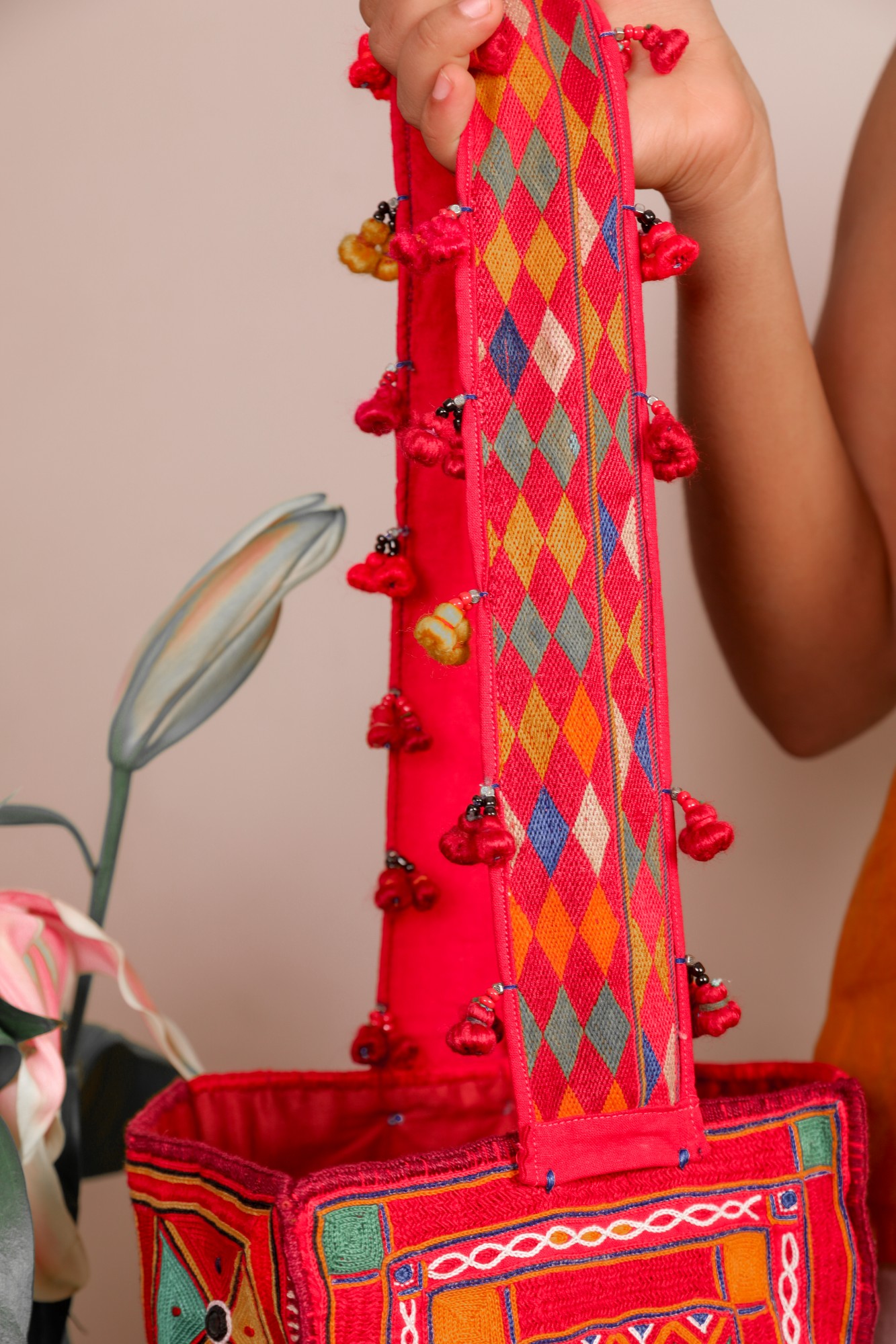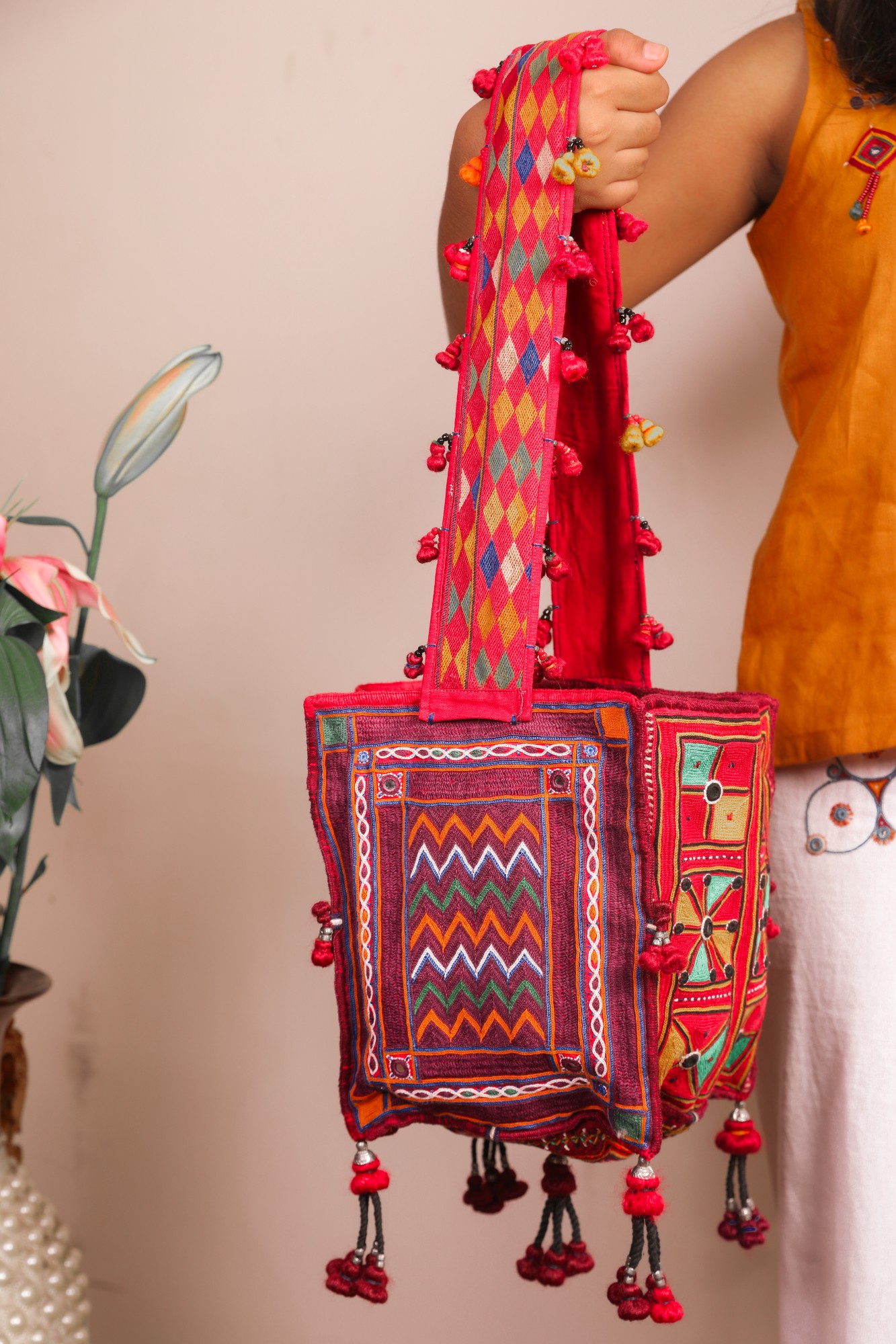 This unique bag features bold embroidered panels, decorative tassels, and colorful threads that highlight the beauty of traditional Banjara design. The long embroidered strap makes it comfortable to carry while adding a striking visual element to the bag. Carefully handmade by skilled artisans, each Khalchi bag is a piece of cultural storytelling and craftsmanship.