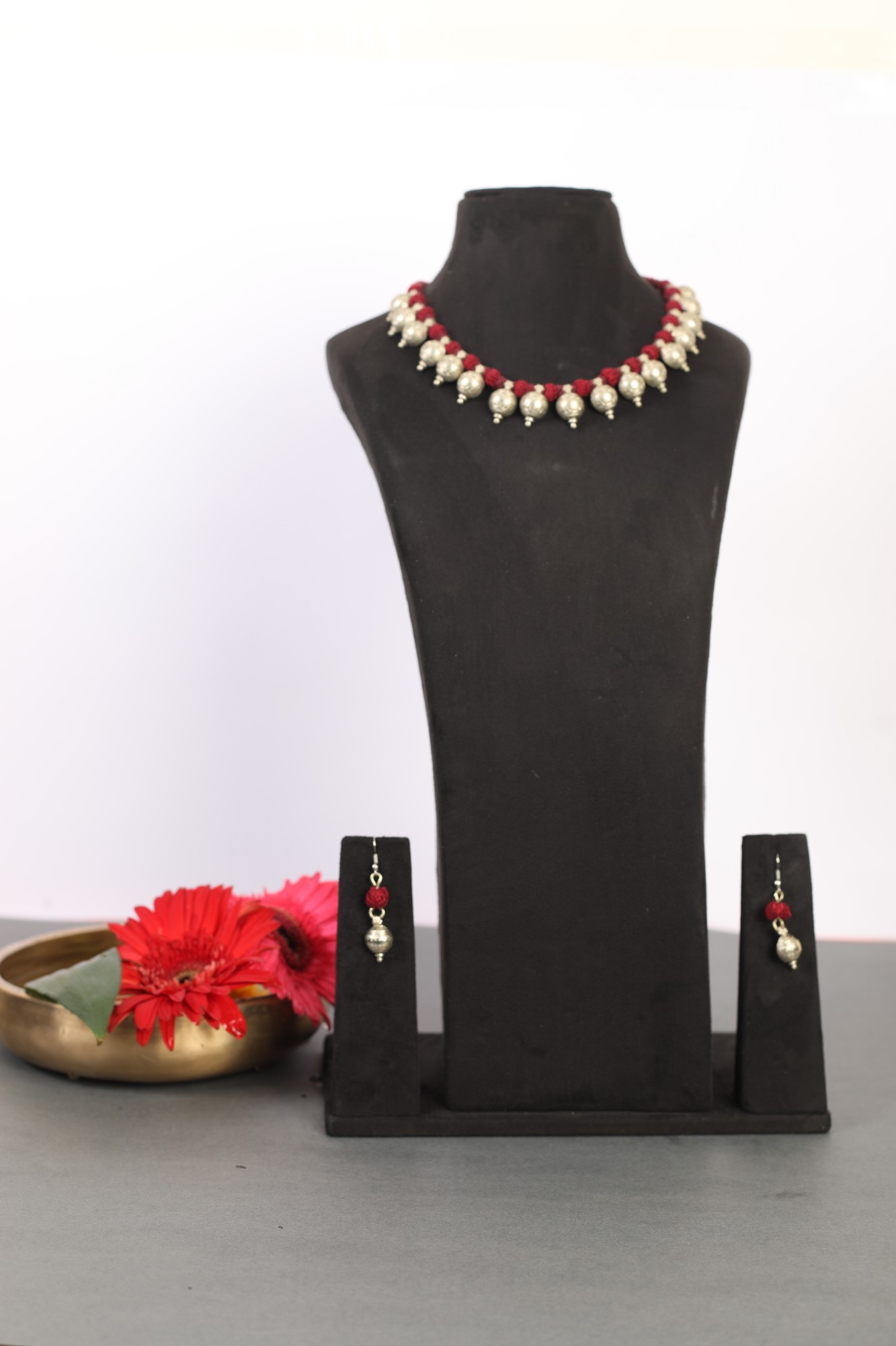 Add timeless elegance to your jewelry collection with this handcrafted Banjara choker necklace and earring set, designed to showcase understated sophistication and traditional charm. The necklace features beautifully arranged antique-finish German silver metallic beads intricately set along a rich maroon thread, creating a striking visual rhythm that highlights the artistry of Banjara craftsmanship.