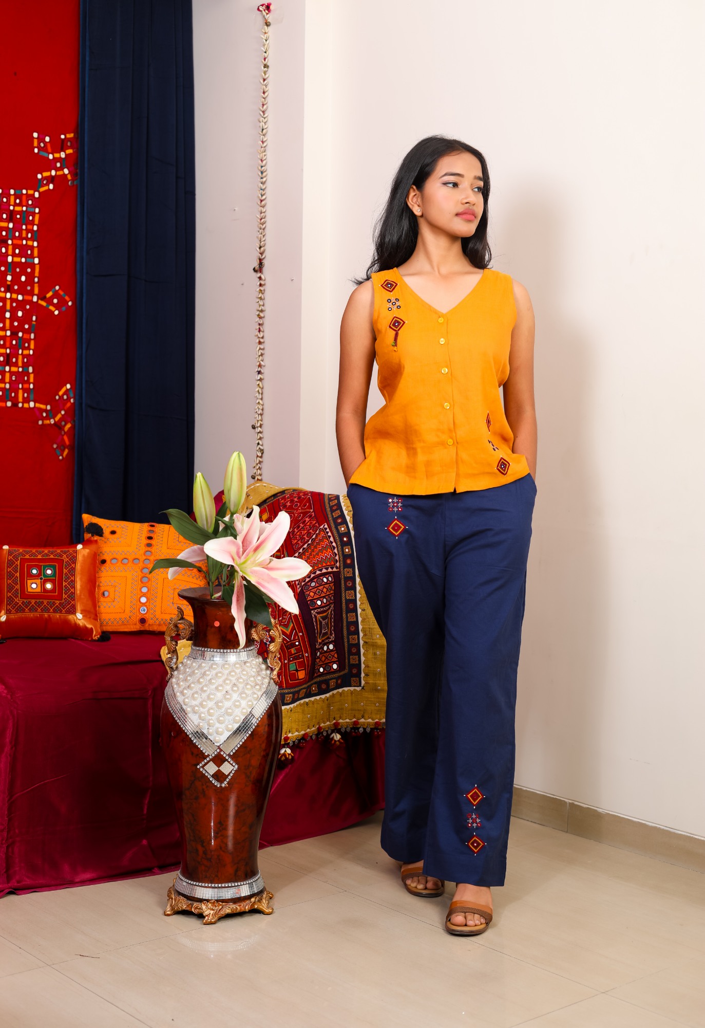 The handcrafted detailing and vibrant embroidery create a unique aesthetic that celebrates heritage while embracing modern fashion. Pair it with trousers, skirts, or ethnic bottoms to create a versatile Indo-fusion outfit. Elevate your wardrobe with this chic Banjara embroidered handloom cotton top.