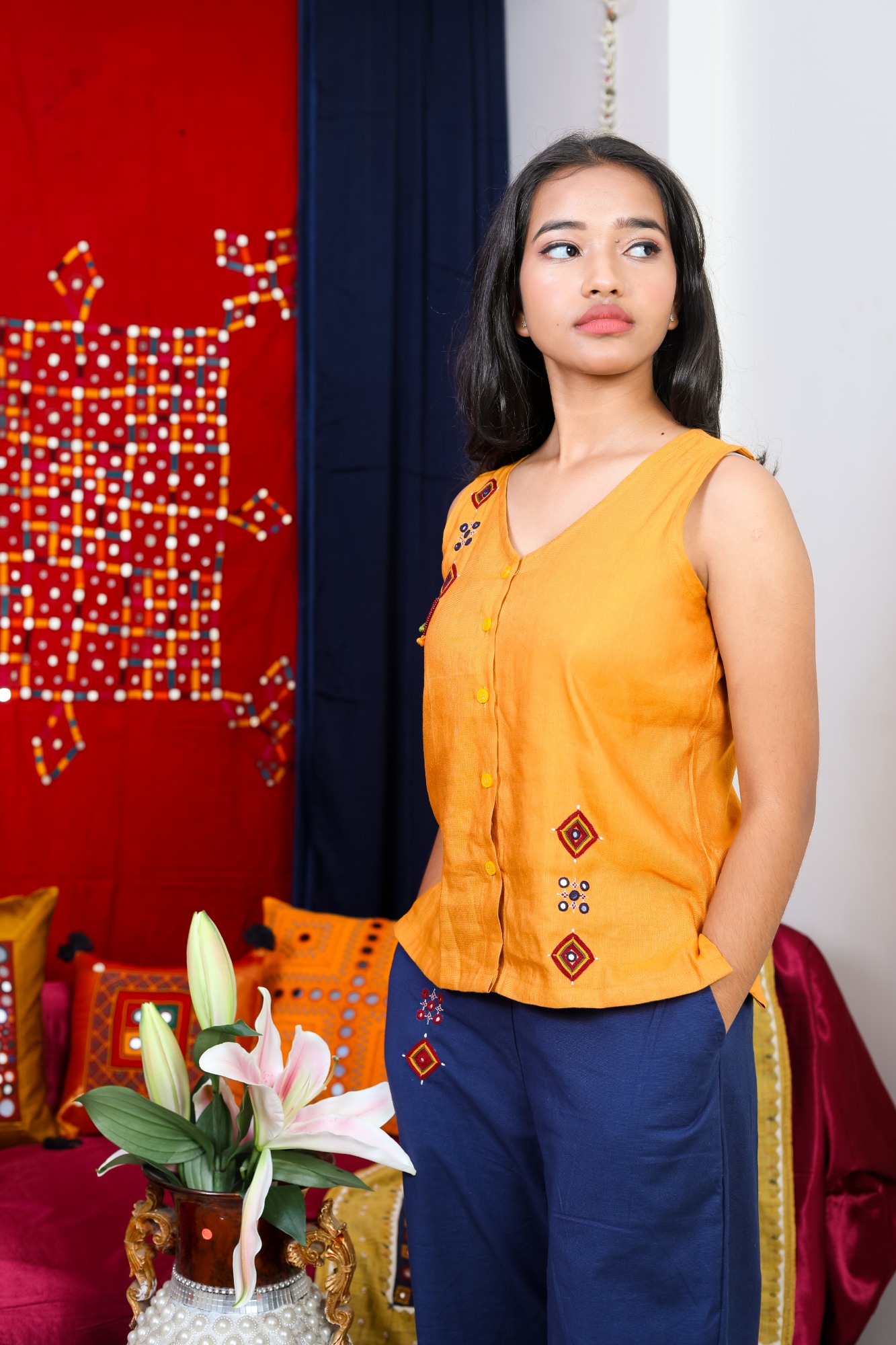 Decorative mirror accents catch the light and add a subtle traditional sparkle, enhancing the exclusiveness of the design. Lightweight, breathable, and body-friendly, this sleeveless top is perfect for all-day wear, making it ideal for casual outings, cultural events, or stylish ethnic looks.