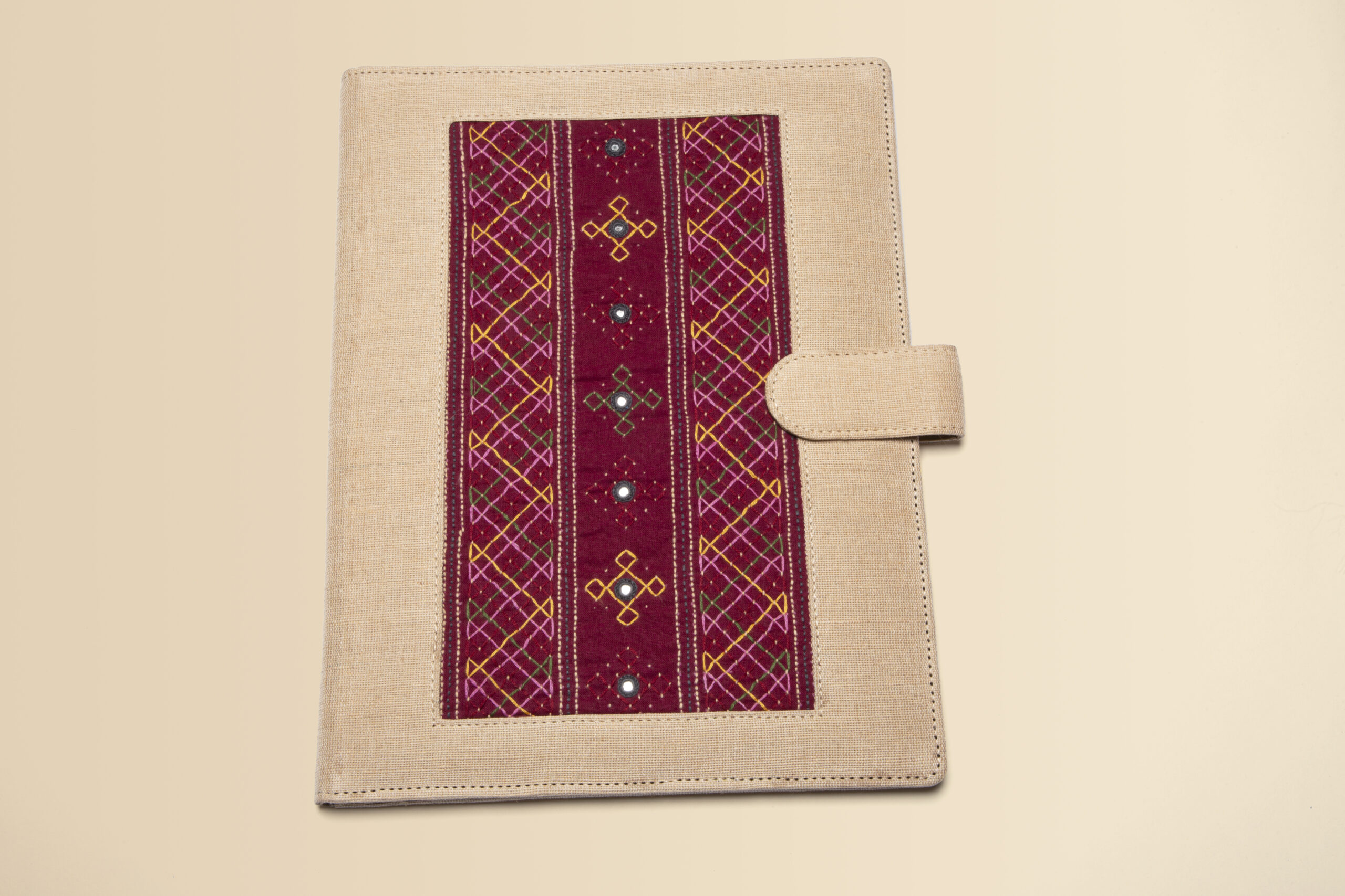 Eco-friendly jute file folder with intricate ethnic embroidery—perfect blend of sustainability and style for everyday organization.