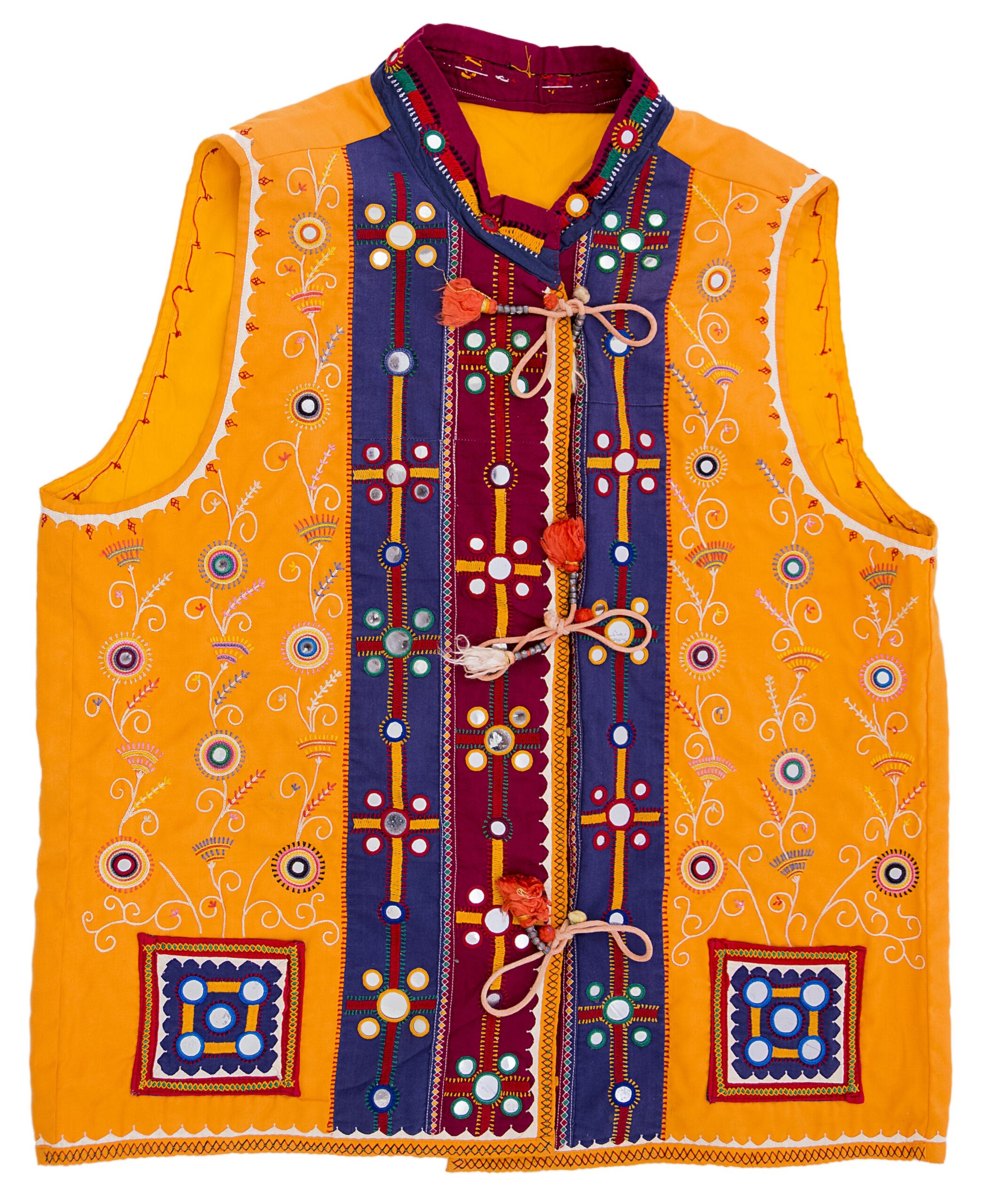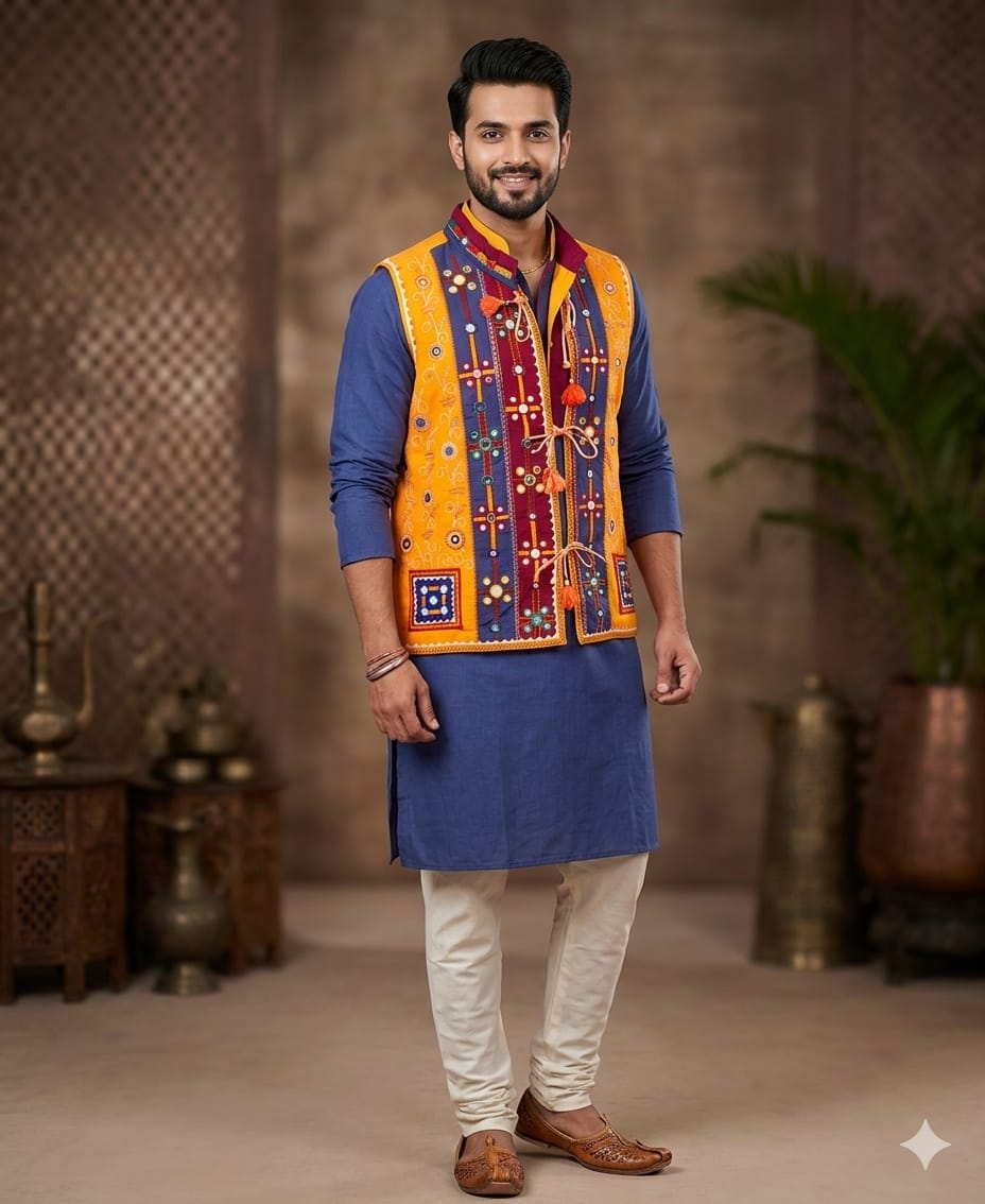 The bright yellow base is beautifully complemented by bold multicolor patterns and decorative tassel tie-up closure, giving it a unique and festive appeal. Perfect for weddings, festivals, and special occasions, this jacket pairs effortlessly with kurtas or shirts for a standout look.