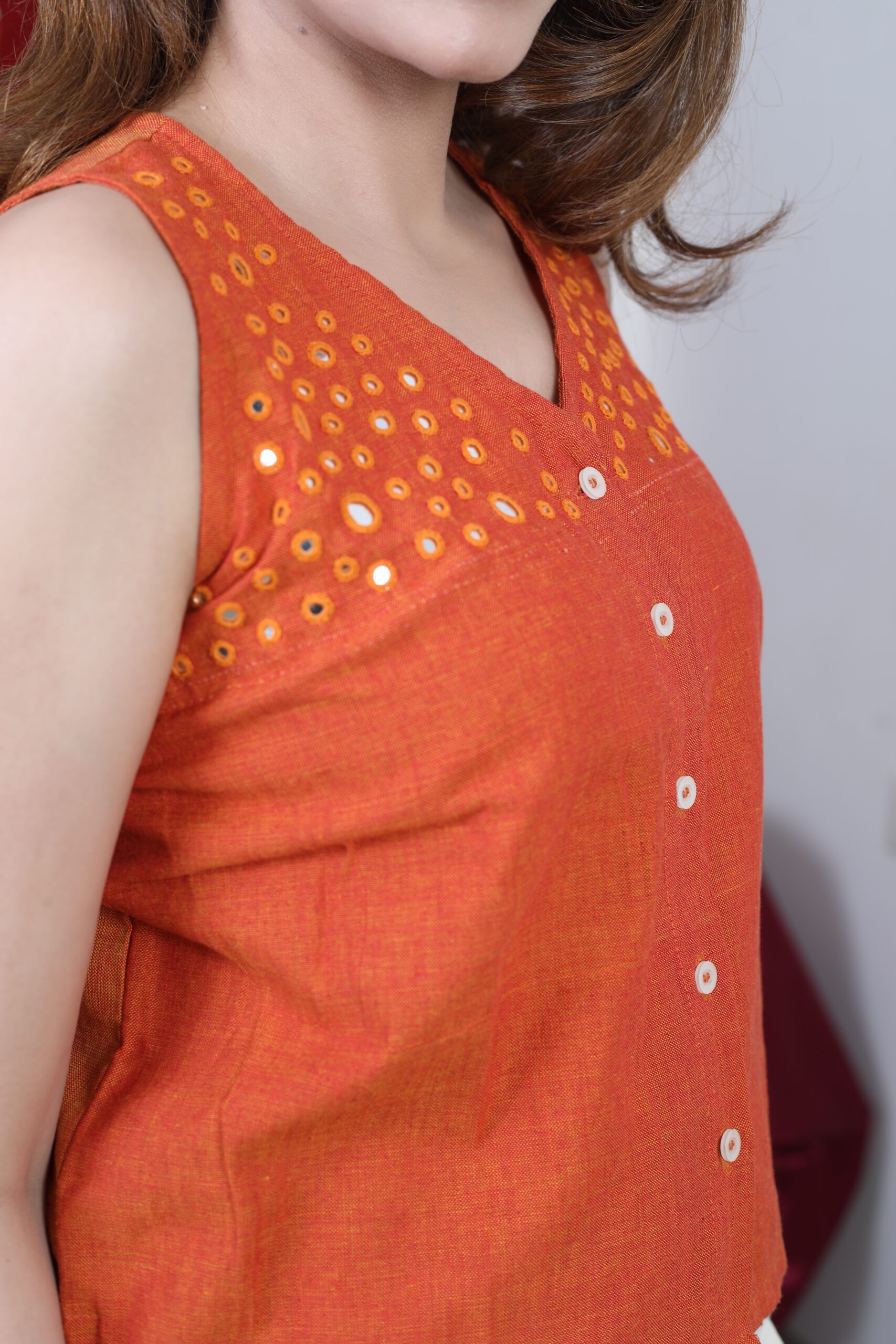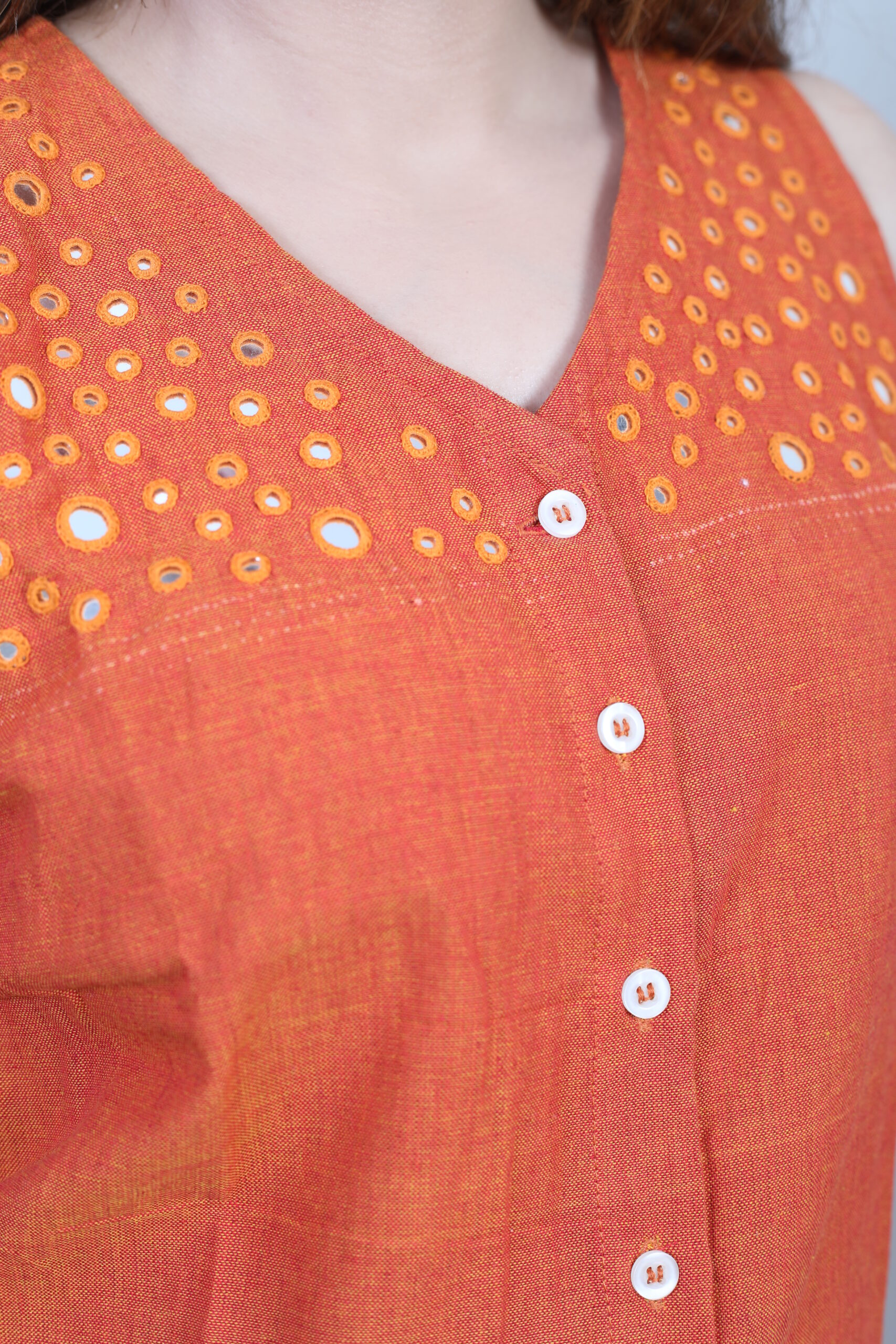 Upgrade your everyday ethnic style with this elegant rust orange co-ord set designed for comfort and effortless sophistication. The sleeveless top features delicate embroidery detailing on the yoke, a flattering V-neckline, and a button-down front that adds a modern touch to traditional aesthetics.